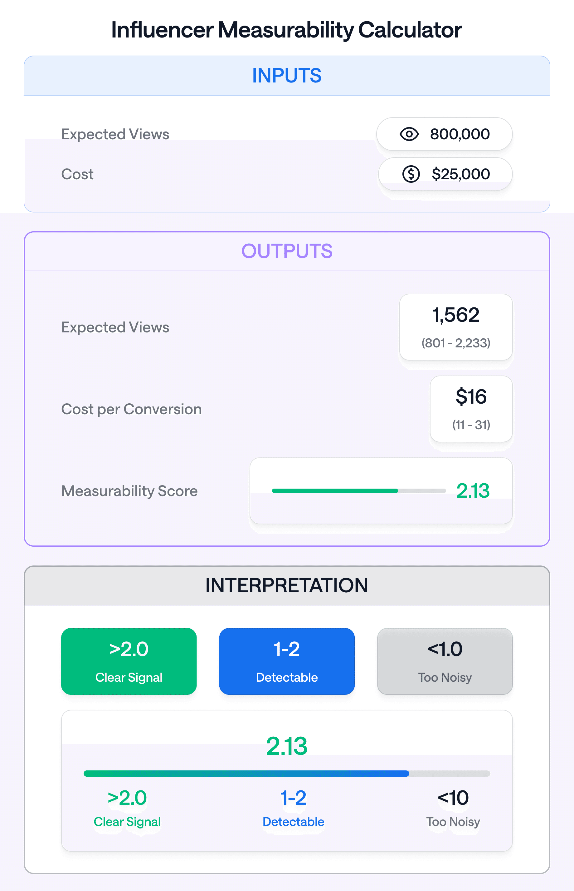 BlueAlpha built a custom measurability calculator that answers the question every media buyer asks: "If I sign this creator, will we even be able to detect the impact?"