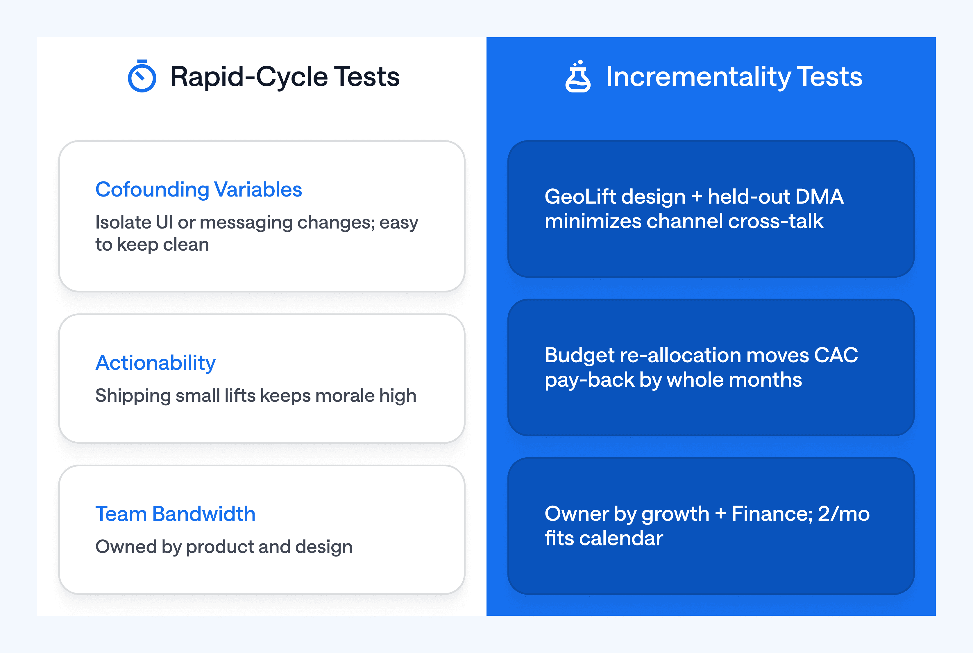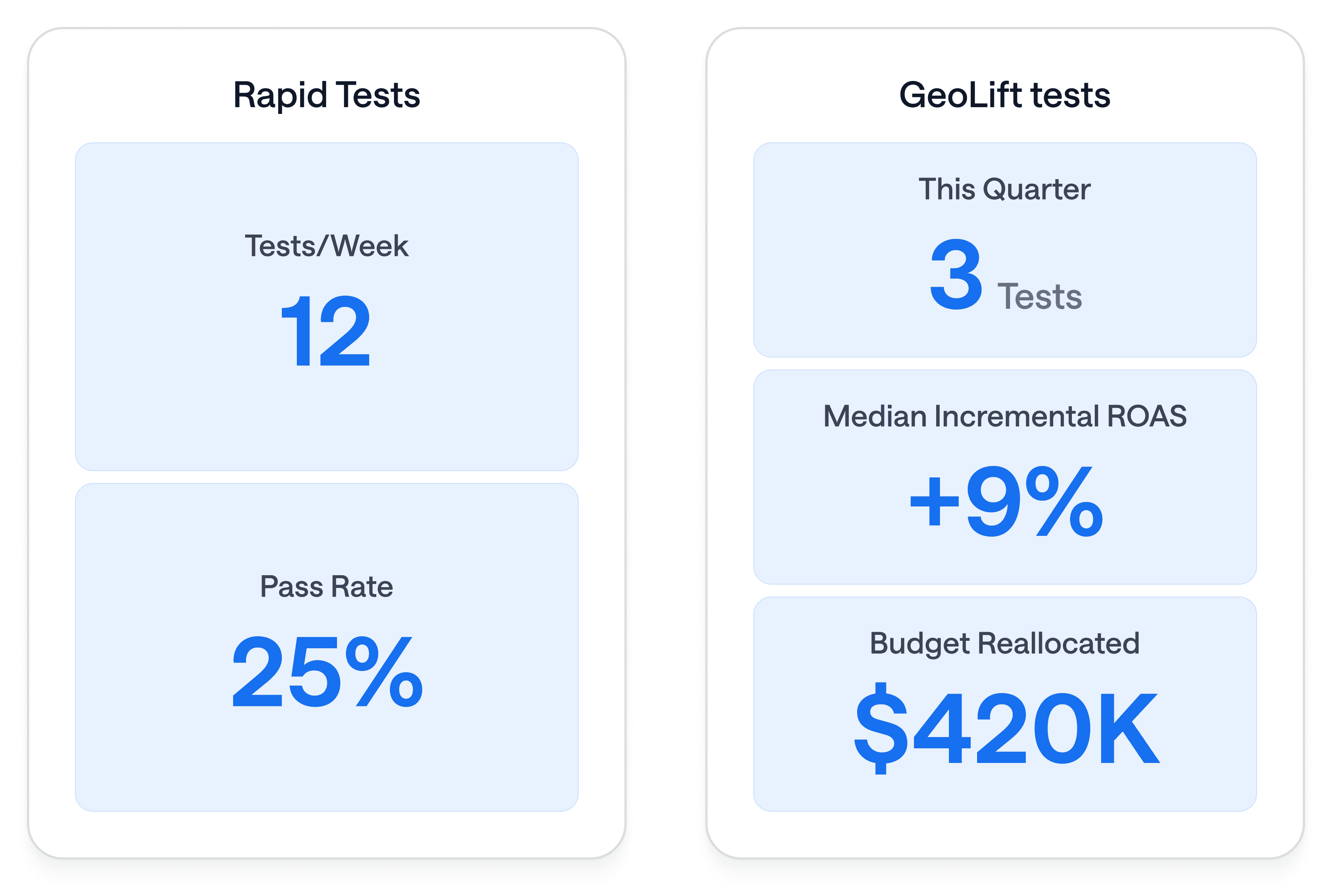 Benchmarks & dashboards - Your dashboard template should show separate panels: Rapid tests on the left, GeoLift tests on the right, so executives see both the volume of learning and the big dollar shifts.