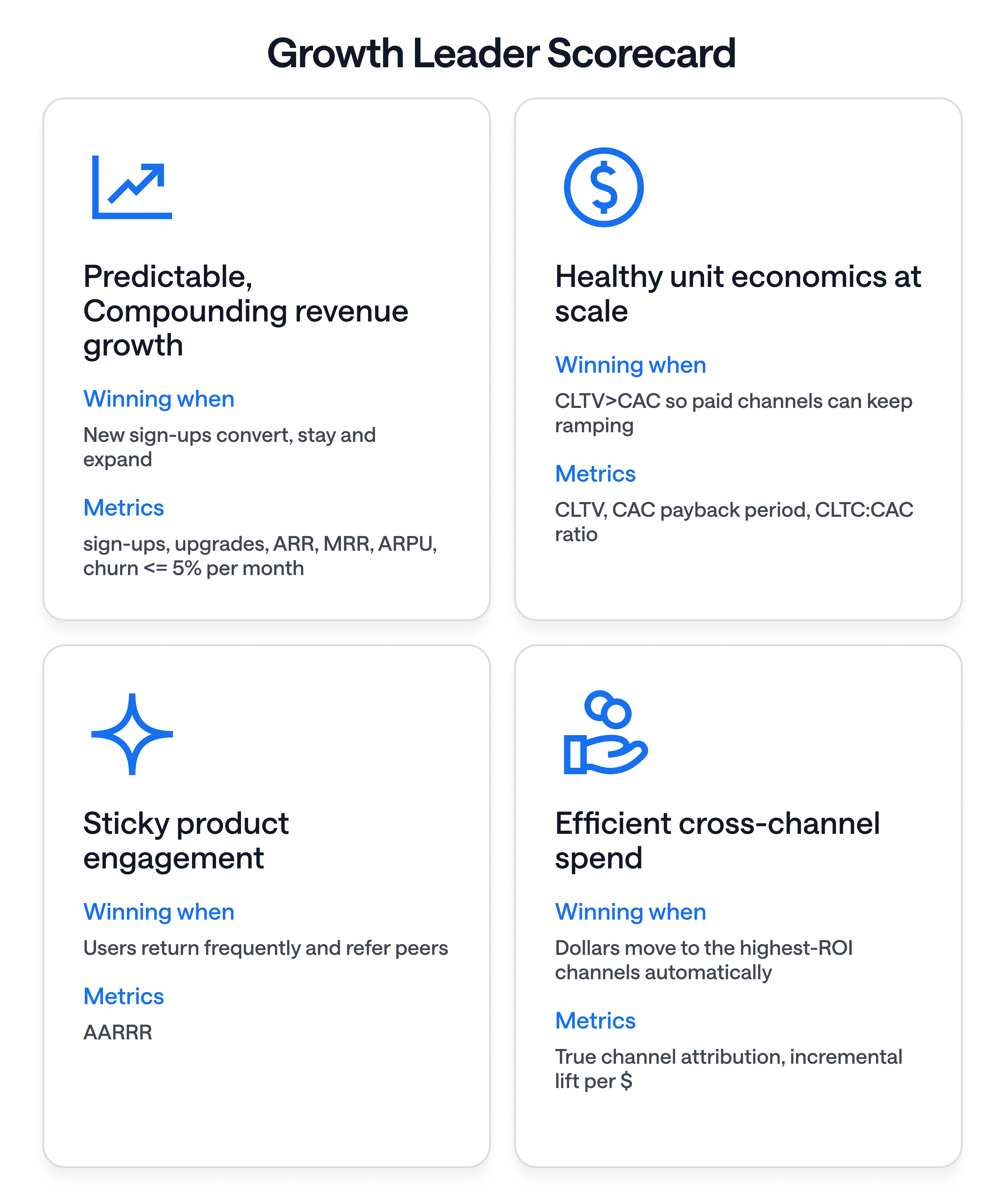 Supporting metrics → CAC pay-back, 90-day retention, burn multiple.